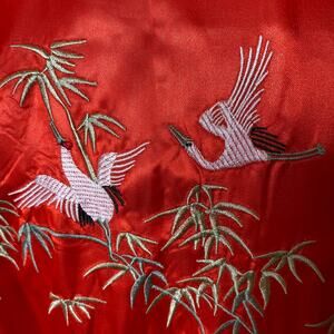 Vintage Oriental Embroidered Kimono Robe Cover Up Red Floral Crane Waist Tie