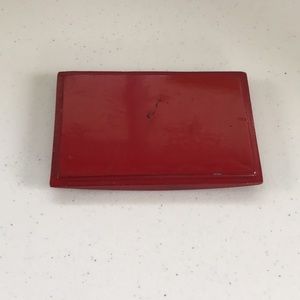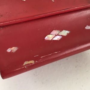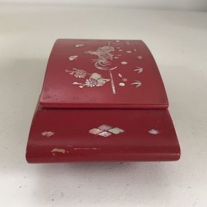 Vintage Oriental Red Lacquer Jewelry Box with Abalone Inlay with Rooster Design. Box is 7 inches long by 3.5 inch width. Not a large box and was likely someone’s keep sake box for awhile. This box has a large amount of inlay all throughout the box. Sadly, the box has seen better days and some of the lacquer is damaged and removed from travel or use. Item though is sold in as is condition but feel free to leave an offer. Happy buying!
