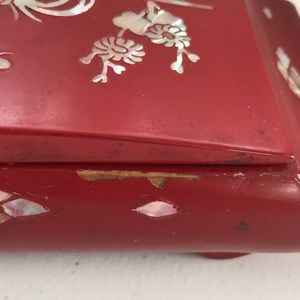 Vintage Oriental Red Lacquer Jewelry Box with Abalone Inlay with Rooster Design