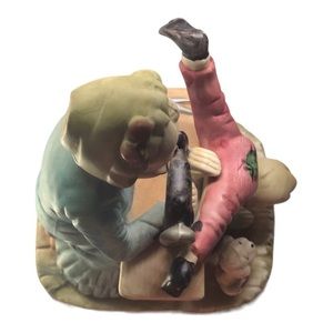 Grandma sewing grandson’s pants while he’s wearing them bisque figurine. His puppy is sitting looking on. Used in good condition. There is a small crack on the base by the grandsons hand that looks like it’s been repaired(not real sure if it’s a crack or not). No other chips/cracks noted. Measures 8” tall X 6” long X 5” wide. Pet/smoke free home.