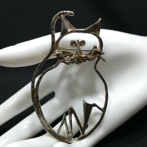 Description: This is a vintage original cat outline brooch, mid-century modern, distressed plated pin. This brooch was reproduced in later years, however, this is the one from the 1950s to 1960s. It was gold plated and most of the plating has worn off and the cat is more silver than gold. If you look at the clasp on the back, you will see this is the older version of this design.