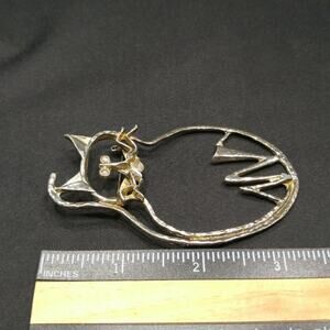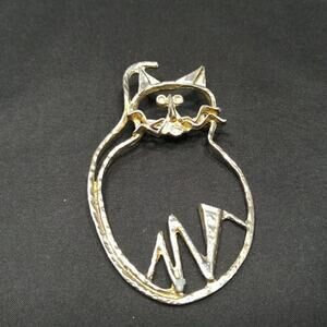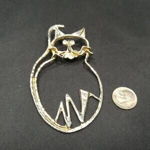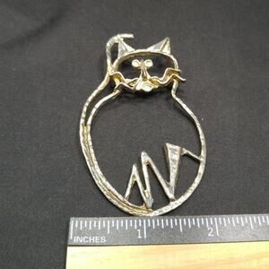 Vintage Original Cat Outline Brooch, 3 1/2 Inches, Distressed Plated Pin