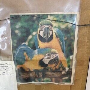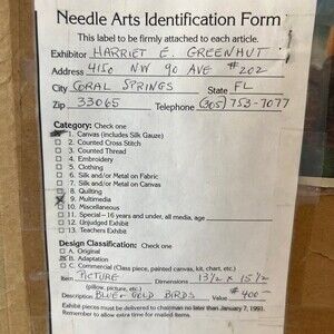 Vintage Original embroidery needlework 3D framed (no glass) art blue and gold birds By H Greenhut. Condition is pre-owned. Inspired by a picture in the Miami Herald, retail price in 1991, $400. Measures with frame: 13.5 x 16.5 inches