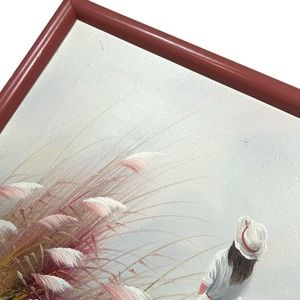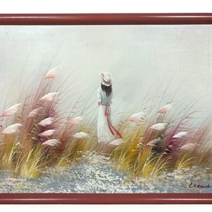 Vintage, original painting of a girl in a dress looking over a gray and foggy sea. The painting is framed in a pink frame, comes with hardware ready to hang on your wall. The piece is signed by the artist. Beautiful and haunting.