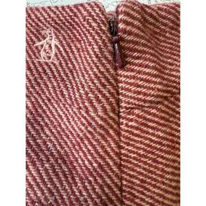 70% wool, 30% nylon blend in a beautiful diagonal herringbone pattern. Rose/mauve pink color that works year-round. A-line silhouette is universally flattering. Side pockets add functionality. Fully lined in coordinating burgundy. Back zip closure. Embroidered Penguin logo at hip.