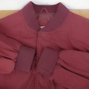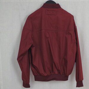 This listing is for a vintage bomber style light jacket by "Original Windbreaker" It is in a crimson-ish red with stretchy trim.