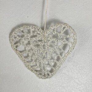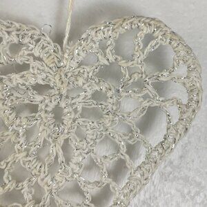 Vintage Ornament Crochet Heart Hand Made White Thread Sparkly Christmas Heart
