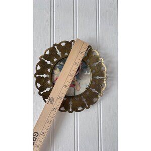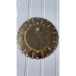 This set of two vintage brass wall plates features intricate floral designs and romantic portraits. Each plate is 8 inches in diameter, adding a touch of timeless elegance to decor. Ideal for collectors or as unique decorative accents.