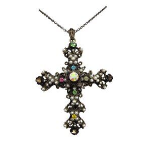 This vintage necklace showcases an elegant cross pendant adorned with vibrant rhinestones and faux pearls, exuding timeless charm and antique appeal.