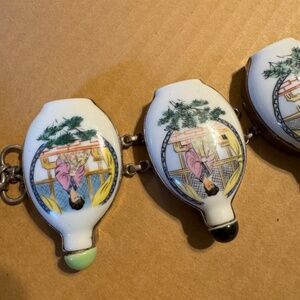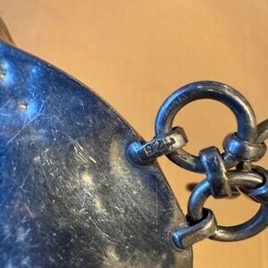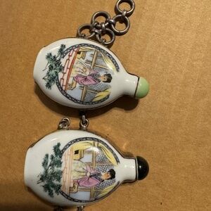 This piece is ornate and different. May be a custom tradeshow piece. It has three Asian snuff bottles encased within 925 silver chain and case. The 925 mark is on chain. 9”L open, closed 3” or 71/2 CM, toggle clasp that needs replacing as it is hard to lock in.