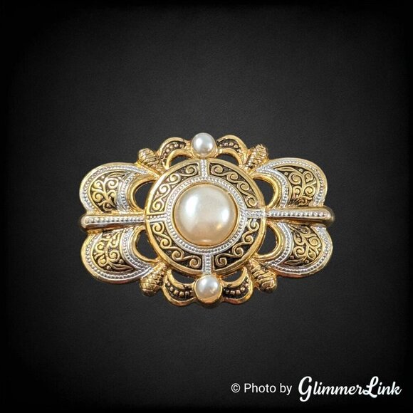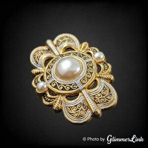 Vintage Ornate Damascene Style Scallop Faux Pearl Gold Tone Brooch