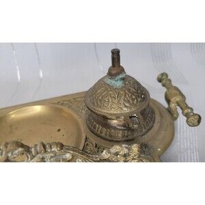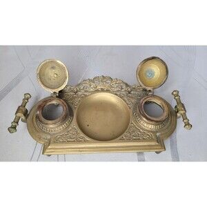 Vintage Ornate Double Ink Well Brass w Inserts Covers Decorative Desk Victorian