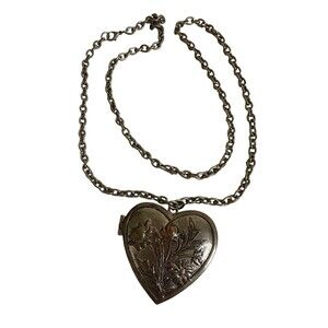 This Vintage Ornate Engraved Design Silver Tone Heart Locket Pendant Necklace is a beautiful piece of jewelry perfect for women who appreciate vintage and antique styles. The pendant features a heart-shaped design with intricate engraving, making it a unique and elegant accessory. The silver plated metal gives it a classic and timeless look, while the snap closure ensures a secure fit. This necklace is a perfect addition to any collection, especially for those who love floral and plant-themed pieces. Made in the United States, it exudes a sense of nostalgia and charm.