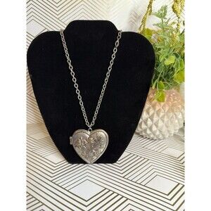 Vintage Ornate Engraved Design Silver Tone Heart Locket Pendant Necklace