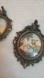 Set of two vintage ornate framed miniature portraits. Features intricate brass frames with colorful illustrations. Perfect for home decor.