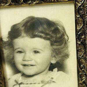 Gorgeous gold frame with original photo of little girl. Swing rear stand. Clear glass front. In very nice pre-owned condition.