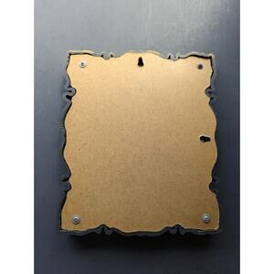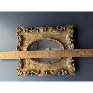 Vintage composite/plastic wall mirror, gold finish with oval mirror. Approx. 7.5”w x 8.75”h x 1”d. Mirror is approx. 5.5”h x 3.5”w. Made of hard plastic with gold faux wood look.