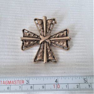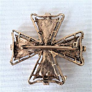Vintage Ornate Maltese Cross Brooch Pin Celtic Royal Gold Tone Iron Rope Unique