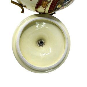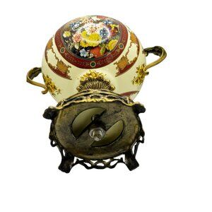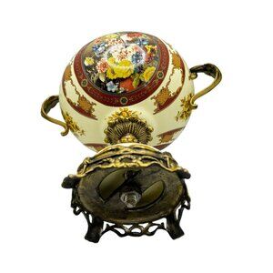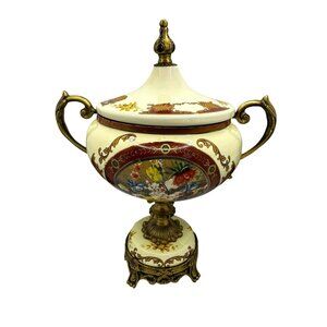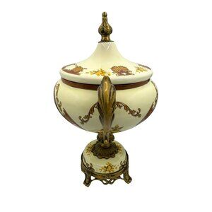 This vintage lidded urn features a floral motif on porcelain, complemented by ornate brass detailing. Its dual handles offer both elegance and functionality, making it suitable for decorative purposes or as a unique centerpiece in a sophisticated setting. Approx. size 11" H x 9.5" W.