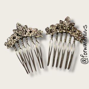 This listing features a set of two small vintage-style hair combs, crafted from silver-tone metal and adorned with sparkling rhinestones in a symmetrical floral and leaf motif. Each comb is approximately half the size of a standard hair comb, making them perfect for accenting updos, side-swept styles, or bridal hair arrangements.