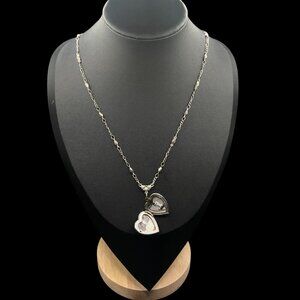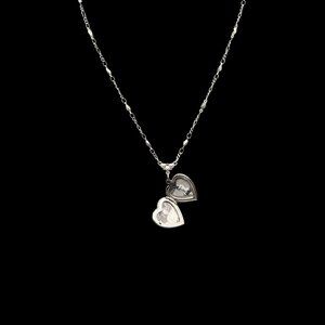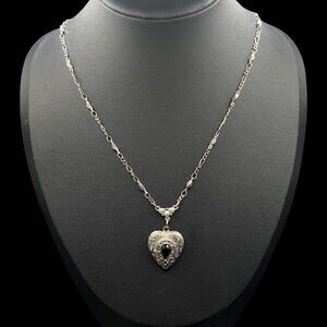 This is a gorgeous vintage locket from an estate collection. The locket is fixed on the chain, shaped like a heart. It's 800 Silver, with an ornate details on the front and accented with a black glass teardrop or pear-shaped gemstone.
