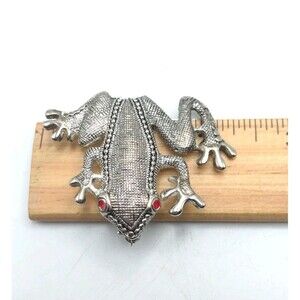 Vintage Ornate Silver Tone Frog Brooch Pin Red Eye Statement Piece 2.75" Cute Gift