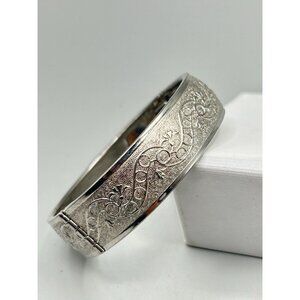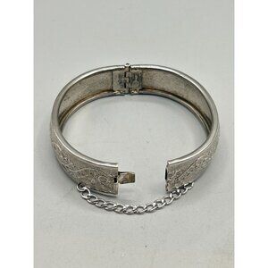 This vintage bangle features intricate floral engravings and a secure hinge closure with a safety chain, adding a touch of timeless elegance to any outfit.
