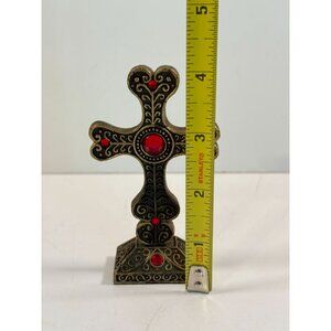 Vintage Ornate Standing Cross Decor Paperweight Red Jeweled Stones Heart Scroll Design
