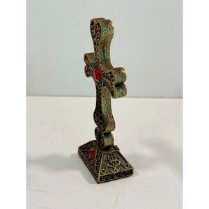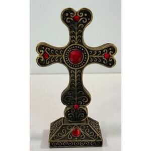 Vintage Ornate Standing Cross Decor Paperweight Red Jeweled Stones Heart 4" Tall