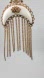 This rare enamel crescent moon is adorned with a crown-like motif and an antiqued goldtone openwork frame with a sun at the top. 12 graduated tassel chains hang from the moon. Please note that the chains are not the same length on each side.