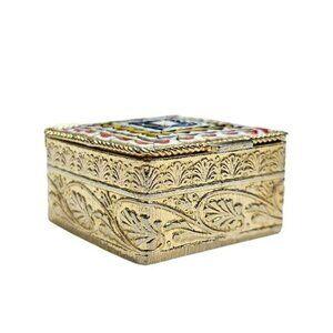 This vintage trinket box, an exquisite example of fine craftsmanship, features an ornate design atop a meticulously detailed filigree exterior. It's a charming piece for storing small treasures or adding a touch of elegance to any space. The intricate patterns and vibrant colors evoke a sense of timeless beauty and sophistication.