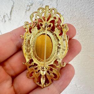 Vintage Ornate Victorian Gold Brooch Blue Cabochon Female Figures Bodice Ladies