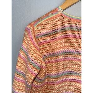VTG. Open weave. Pretty pastel shades of pink, orange, yellow, green. Button detail along shoulder. Relaxed boxy fit. 55% ramie, 45% cotton. PLEASE READ - small snag in back, see pic, otherwise great preowned condition. Professional, highly rated seller, quick shipper, open to offers! Multiple vintage items available, bundle to save!