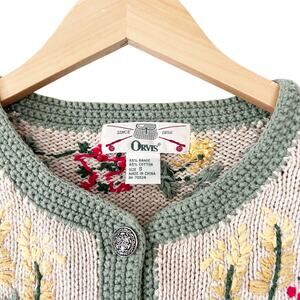 Vintage Orvis Tan Flower Embroidered Knit Cardigan Sz S