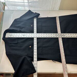Elegant black dress with button-up front. Features two chest pockets and short sleeves for a classic look.
