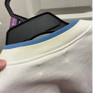 Some yellowing on the back of the neck, and there's writing on the inside neck of the sweater, but you can't see it through to the other side. So it isn't actually affecting the sweater. Will leave it up to the buyer whether you want to try any stain treatment on this sweater or wear it as is. See photos for details.
