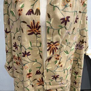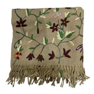 Vintage Oscar Da La Renta Scarf Tan Wool Floral Embroidered Fringe Boho Hippie