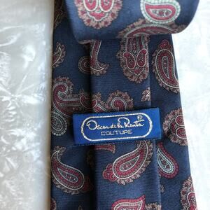 Vintage Oscar De La Renta Couture Blue Red Gray Geometric Paisley Work Office Business Wedding Neck Tie