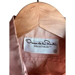 This is a vintage Oscar de la Renta blouse in tan color, featuring a semi-sheer satin fabric with a button-down closure and a collared neckline. The blouse has long sleeves and a casual sleeve style, suitable for party, casual, workwear, or business occasions. It is a size 8 and machine washable. The blouse has a retro 80s vibe and is lightweight, making it suitable for all seasons. Excellent Condition- possibly never worn.