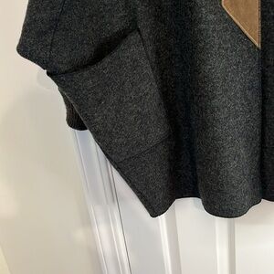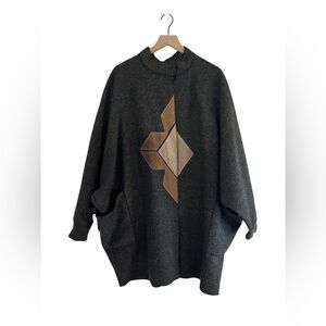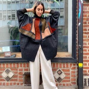 This is the absolute coolest south western vintage piece ever. Boiled wool blend. Dolman sleeves. Super oversized. Suede panels create a geometric pattern on both the front and back. The second & third pictures are of another Osgood Smuk coat to show how this will fit. There is no size, but it can definitely fit an XS to a XXL depending on desired fit. It has velcro closures. So unique and one of a kind. There is some very minimal signs of wear on the fabric but no tears noted. Minor discolorations on leather. Some pilling at the cuff. Otherwise it is in AMAZING condition. A forever piece.