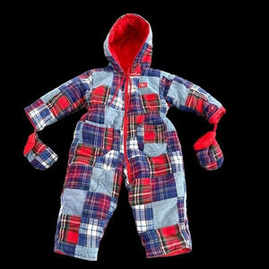 Vintage Osh Kosh B’Gosh Baby 12 months Patchwork Pram Snowsuit Flannel Mittens