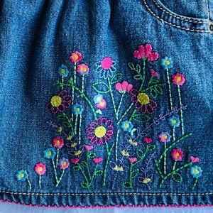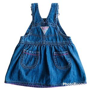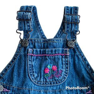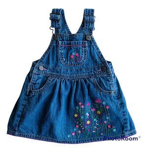 Vintage OshKosh B'Gosh Vestbak overall denim jumper in toddler girls size 12 months. Made in Bangladesh of 100% cotton. Whimsical embroidered floral accents with front, back, and chest pockets. Excellent condition with no holes, tears, stains, or ripped seams. Smoke free, pet friendly home.