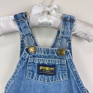 Vintage OshKosh B'gosh Blue Jean Overalls. Made in the USA. Baby toddler boy or girl size 18 months. Classic vestbak style denim overalls with adjustable straps and snaps along the legs. Medium wash. A wardrobe staple!