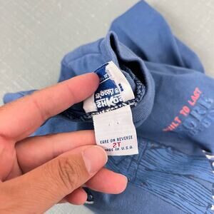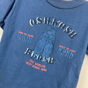 Vintage OshKosh B'gosh Blue Overalls T-Shirt. Toddler boy size 2T. USA made. Casual short sleeve top fearing "The world's best since 1985" overalls design. Minor cosmetic flaw in one sleeve; not sure really how to describe it - maybe a pulled thread inside?