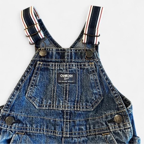 These vintage blue overalls from OshKosh B'gosh feature a classic design with sturdy construction and adjustable striped straps for a comfortable fit. The medium wash denim and contrast stitching add a timeless touch, making them perfect for everyday wear.