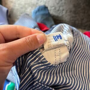 Vintage OshKosh B'gosh Blue Striped Overalls. Baby toddler boy or girl size 18 months. Made in the USA. Classic blue and white railroad engineer stripes. Vestbak style with adjustable straps and snaps along the legs. One clasp is missing bottom piece (see last photo), but seems to hold okay without it (can also easily get a replacement).
