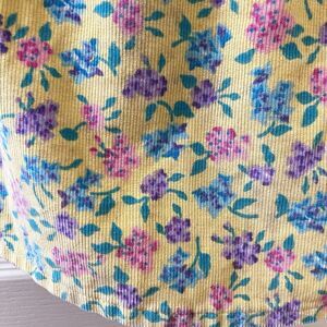 Vintage Oshkosh B'Gosh Yellow Floral Corduroy Overall USA Dress Girls Size 5. FLAWS. Such a great piece and the colors are bright, but there is wear to the corduroy, almost feels rough in places, and there are stains throughout. I tried to wash with Oxi-Clean and was not successful. The stains are light, but are throughout the entire dress, front and back, and with the print, aren't super noticeable, but are definitely there. Please See the Pictures.