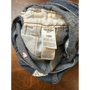 This product is a vintage pair of Oshkosh pink heart embroidered denim bubble overall shortalls in size 18 months. Made from 100% cotton denim, these one-piece shortalls feature a snap closure and are adorned with embroidered pink hearts. The retro style and 90s theme make them perfect for casual occasions in the spring and summer seasons. With the brand's history and quality construction, these overall shortalls are sure to be a stylish and comfortable addition to any little girl's wardrobe.