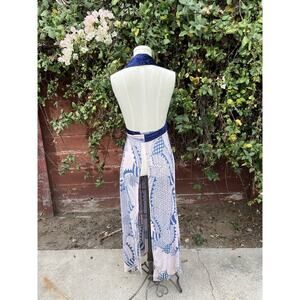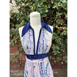 Exude timeless elegance with this vintage Ossie Clark maxi dress, a true statement piece for any wardrobe. Featuring a distinctive Celia Birtwell print, this multicolor garment combines the lightweight charm of chiffon with the luxurious touch of velvet detailing. A sleeveless design with a plunging neckline, it's a perfect match for those seeking both style and comfort. Crafted in the United Kingdom, this wrap dress comes in a size 8 and is designed to flatter with a belted waist. Its versatile nature means it's suitable for a variety of occasions, whether casual outings or more formal events, across all seasons. This collectible designer item is a unique blend of fashion history and contemporary style.
