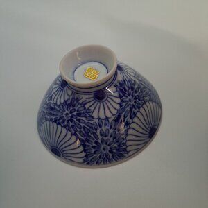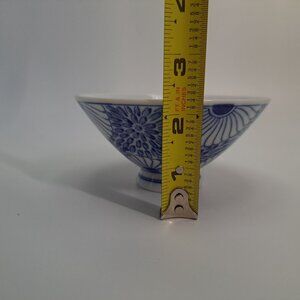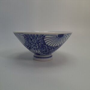 This vintage rice bowl by Otagiri features a blue and white floral design, offering both aesthetic charm and functional use.